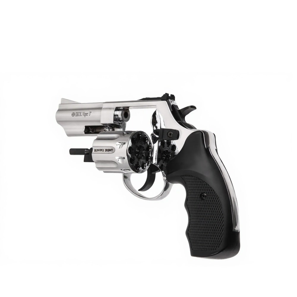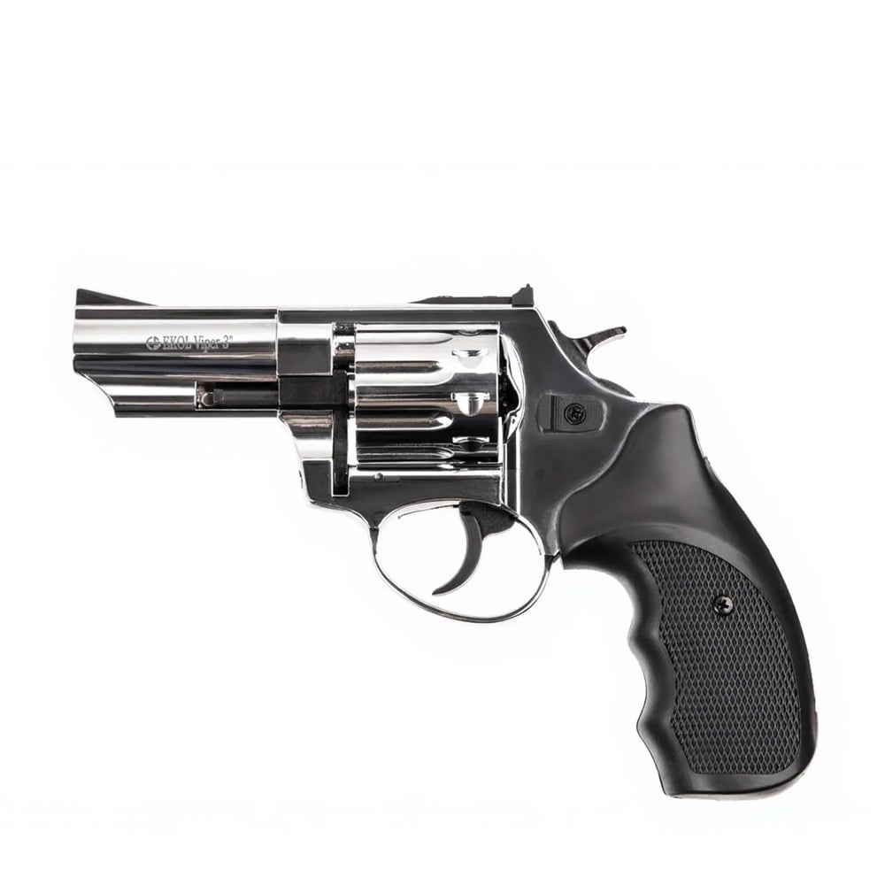 Ekol Viper 3" chrome/black grips – револьвер Флобера калібром 4 мм від турецької компанії Voltran Silah Sana. Рамка Екол Вайпер 3 хром, УСМ з металевого сплаву ЦАМ; гладкий ствол, 9-зарядний посилений барабан, прицільна планка - сталеві; накладки на рукоятку - чорний пластик. Стріляє патронами Флобера, середня швидкість пострілу - 180 м/с. Ударно-спусковий механізм подвійної дії. Прицільні пристосування - регульований цілик і фіксована мушка. Купити револьвер Флобера Voltran Ekol Viper 3" потужністю до 7,5 Джоулів в Україні можна без дозволу з 18 років.