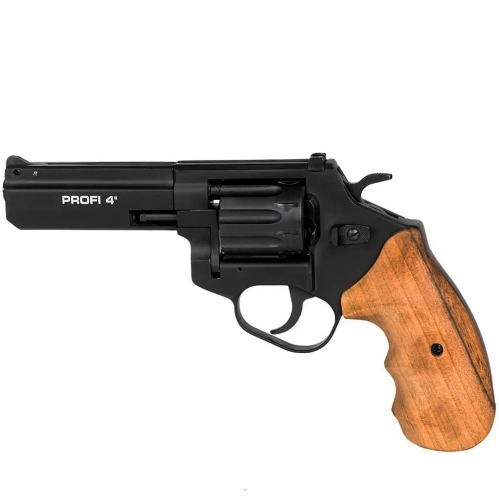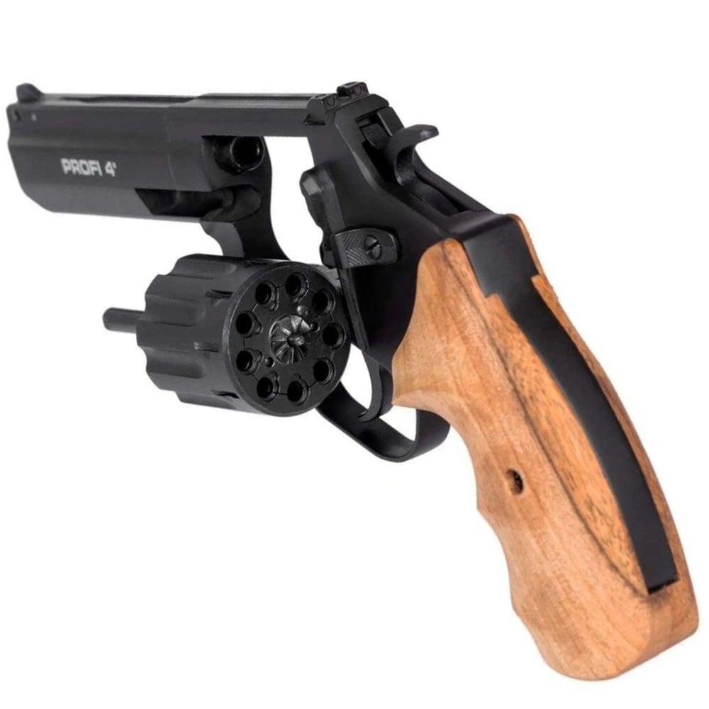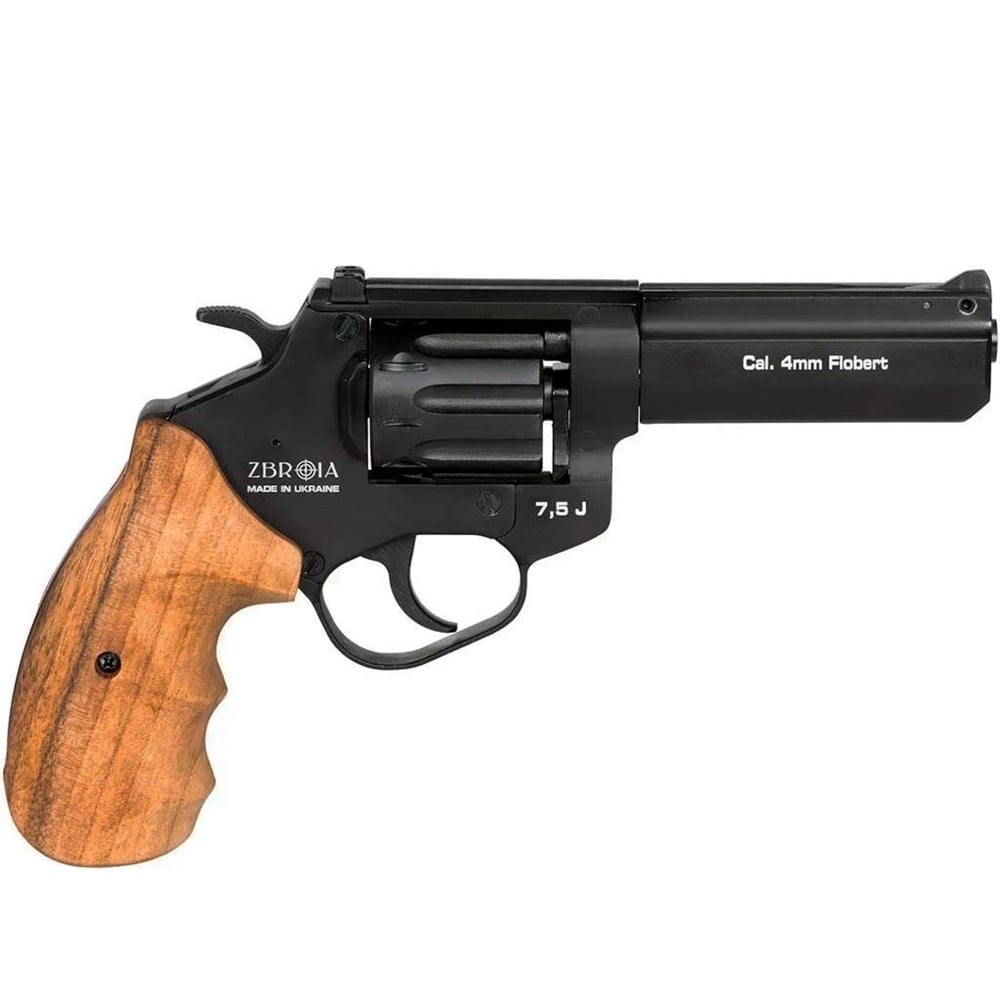 Profi-4" чорний/дерево – револьвер Флобера калібром 4 мм від української компанії Zbroia. Рамка Профі 4" металева; УСМ, нарізний ствол на 6 нарізів, 9-зарядний барабан - сталеві; накладки на рукоятку - натуральний бук. Револьвер Profi 4" стріляє патронами Флобера, середня швидкість пострілу - 170 м/с. Ударно-спусковий механізм подвійної дії. Прицільні пристосування - регульовані цівка і мушка. Випускається ще в 2 варіантах: графіт/дерево і чорний/пластик. Купити зброю під патрон Флобера потужністю до 7,5 Джоулів в Україні можна без дозволу з 18 років.