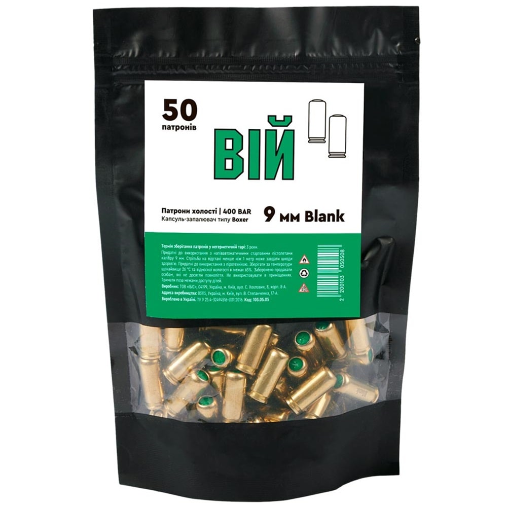 Холостий патрон ВІЙ 9 мм - це український боєприпас без вражаючого елемента, що імітує звук пострілу, викид порохових газів, віддачу, але без руйнівного ефекту. Холості патрони ВІЙ застосовуються в шумових, світлошумових, сигнальних, стартових пістолетах по всьому світу. Загальноприйнятий калібр стартової зброї - 9 мм - для всіх типів пістолетів, автоматів та револьверів СХП.