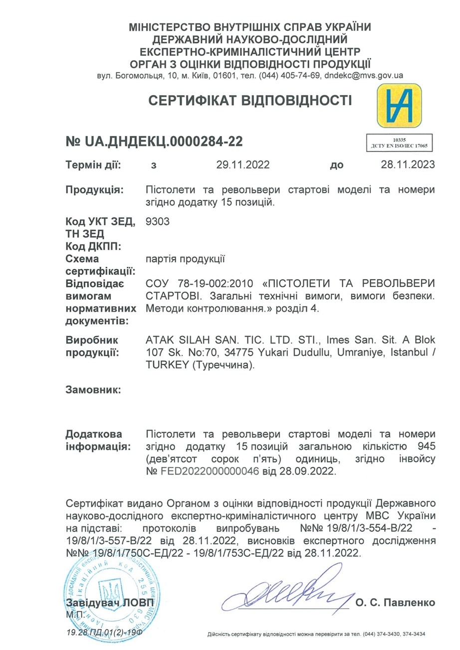На сайті доступні для скачування сертифікати відповідності на кожну партію продукції, що дасть вам змогу уникнути неправомірного вилучення дозволеної стартової зброї співробітниками поліції.