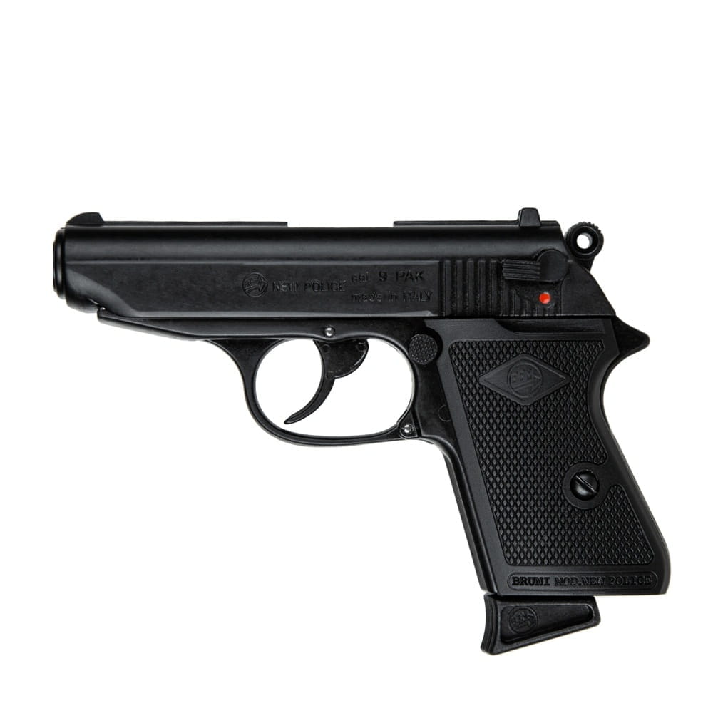 Сигнальний пістолет Bruni New Police 9mm - преміальна італійська копія Walther PPK, німецького «родича» ПМ Макарова. Вага New Police cal 9 pak st - 625 г, габарити - 155х110 мм, калібр - 9 мм. Матеріали - сталь, чорний металевий сплав Zamak, пластикова рукоятка. Упакований в кейс з інструкцією і шомполом для чищення. Традиційно виробник Bruni (BBM) - еталонне лиття і обробка, бездоганне фарбування, акуратні шви і мінімальні зазори.