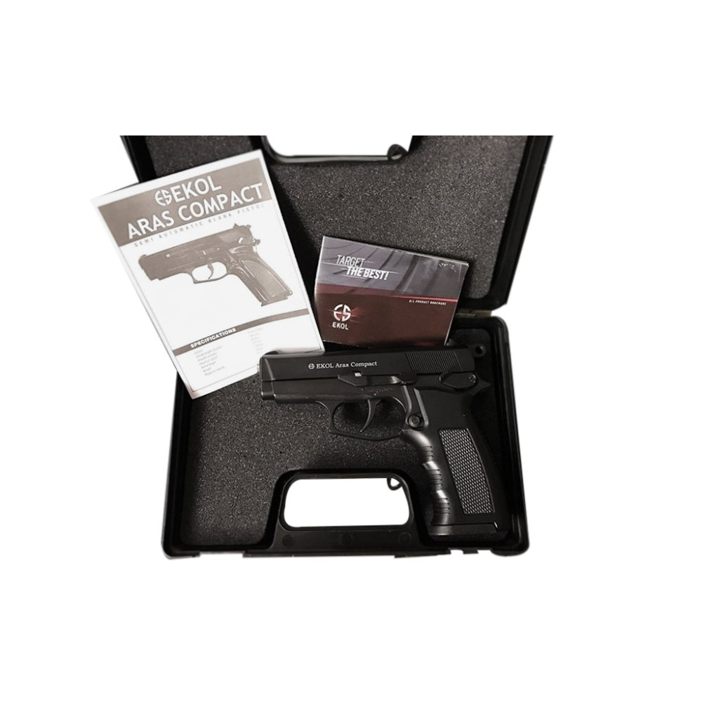 У комплект Ekol Aras Compact 9mm Black входить: пластиковий кейс, 1 магазин на п'ятнадцять холостих калібром 9мм патронів, інструкція з описом.