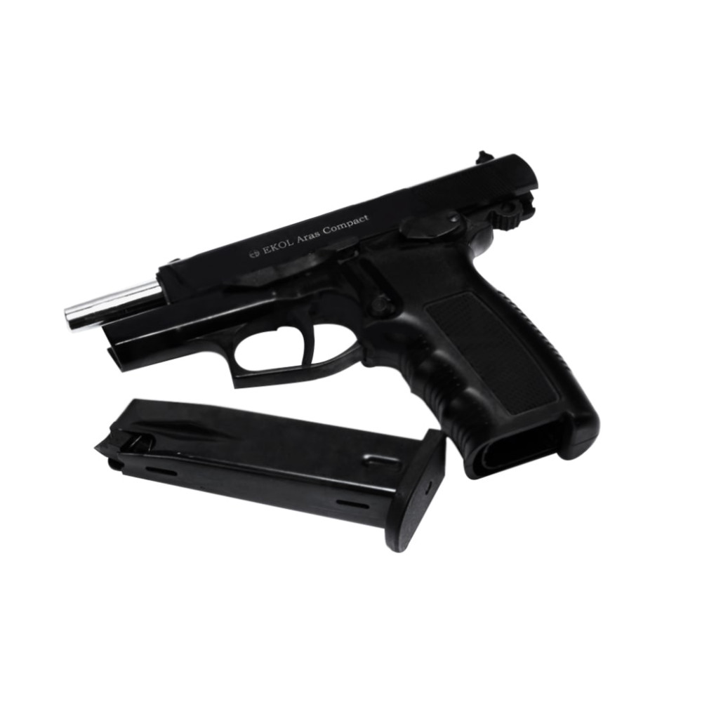 Ekol Aras Compact - стартовий пістолет, він же шумовий, пугач, охолощений, СХП - це сигнально-шумова зброя, що стріляє холостими патронами калібру 9 мм. Для чого потрібний: подання звукових сигналів на спортивних змаганнях, для самооборони, відлякування тварин, на полюванні, у театральних спектаклях та кіно. Ekol Aras Compact виготовляється за макетом бойового ствола, копіюючи зовнішній вигляд, довжину ствола, ТТХ, пристрій, матеріали запчастин, вагу та принцип роботи цієї зброї, включаючи виліт гільзи та віддачу.