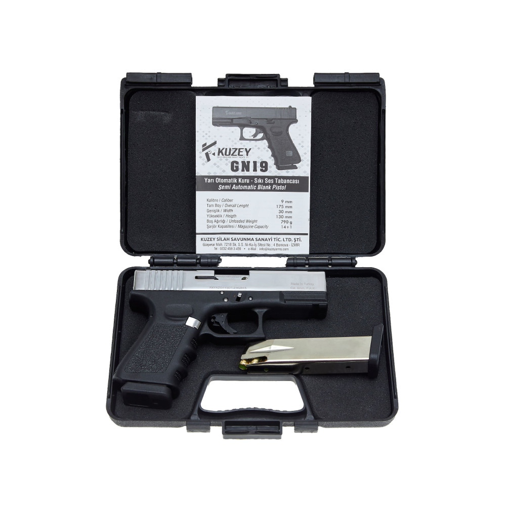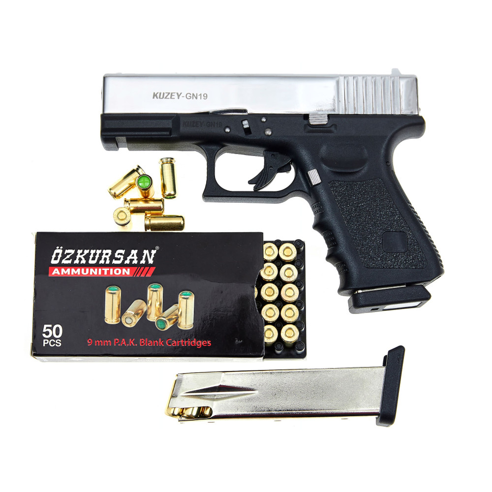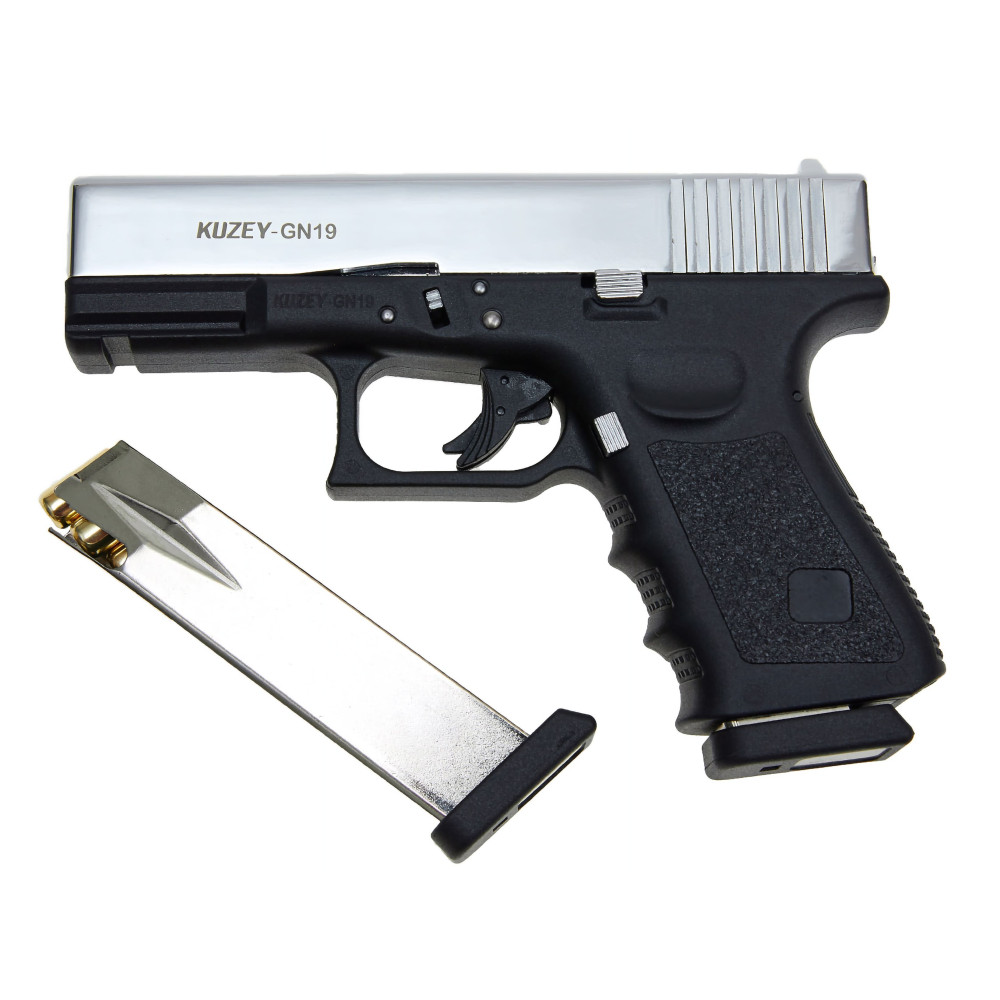 Стартовий пістолет KUZEY GN-19 Chrome - преміальна охолощена турецька репліка суперпопулярного австрійського Глок 19. СХП KUZEY GN-19 Хром важить 790 г, габарити - 175х130 мм, калібр холостого патрона - 9 мм. Матеріали - сталь, метал ЦАМ і жаростійкий пластик. Упакований у кейс з інструкцією і додатковим магазином. Як завжди у Kuzey Arms - чудовий пластик, ідеальні шви та зазори. Неперевершене виконання та якість - жодного браку за три роки.