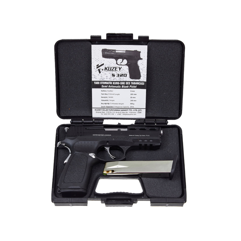 KUZEY-S320 - стартовий пістолет, він же шумовий, лякало, охолощений, СХП - це сигнально-шумова зброя, що стріляє холостими патронами калібру 9мм. Використовується для подачі звукових сигналів на спортивних змаганнях, для самооборони, відлякування тварин, у театральних виставах і кіно. Виготовляється за макетом бойового ствола SIG Sauer P365, копіюючи зовнішній вигляд, матеріали, вагу і принцип роботи справжньої зброї Зіг Зауер П365, включно з вильотом гільзи.
