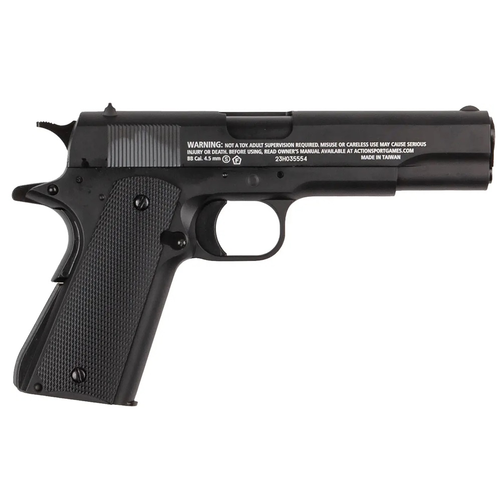 ASG 1911 US-C Blowback 4,5 мм копіює американський вогнепальний Colt M1911A1, який, згідно зі знаменитою фразою його творця Семюеля Кольта, вирівняв шанси людей, яких бог зробив сильними і слабкими. Зброя з грандіозною історичною вагою і символічною значущістю, яка замінила застарілі револьвери, батько більшості сучасних багатозарядних пістолетів, що відвоювала 2 світові війни, популярна серед гангстерів часів Великої депресії і сухого закону.