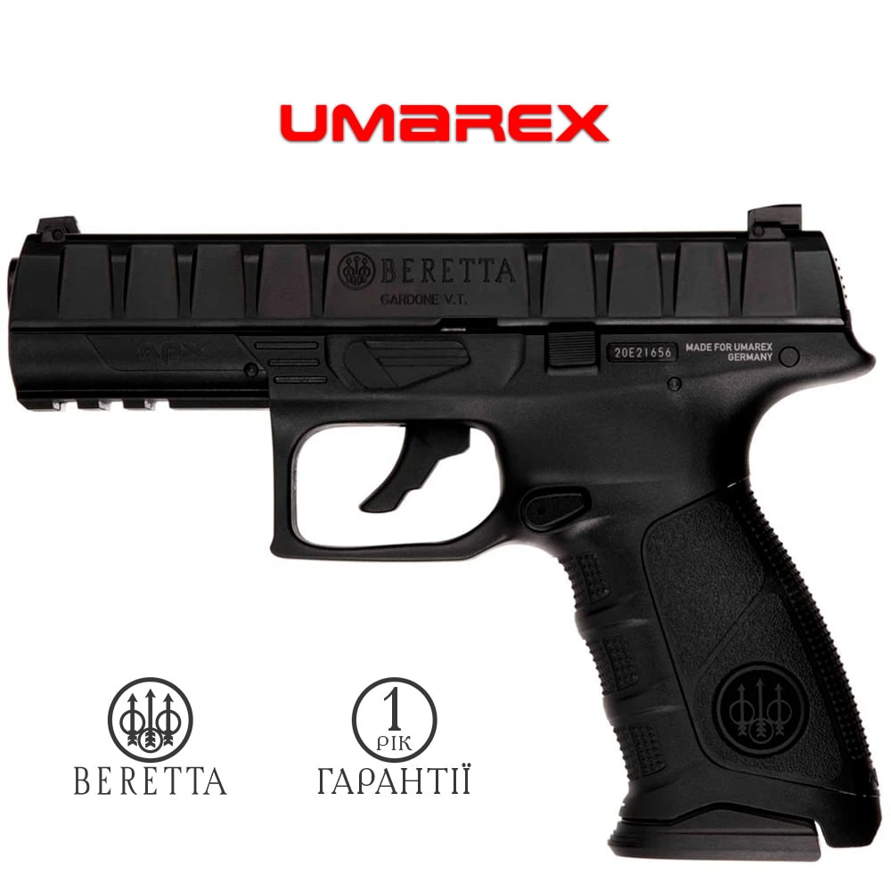 Пневмат Beretta APX від Umarex достовірно копіює італійську бойову Beretta 8 APX - красиву глокоподібну модель, яка в деяких моментах ергономіки і функціоналу випередила хвалений Глок. З 2017-го з'являється в продажу на ринку. Сучасний дизайн з великими насічками по всій довжині затвора надає моделі впізнаваності та хижого вигляду.