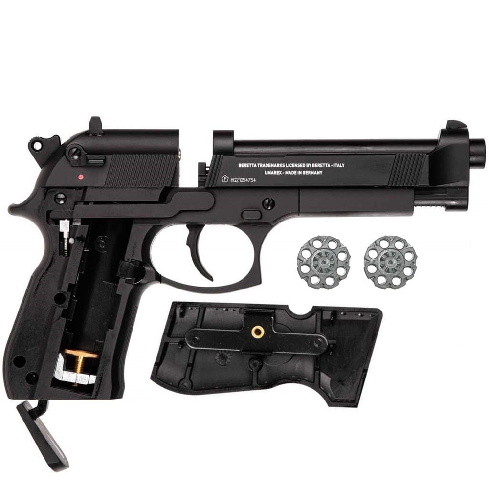 Umarex Beretta 92 FS – газобалонний пневматичний пістолет калібром 4.5 мм від преміального німецького бренду Umarex. Кульовий пневмат Умарекс Беретта 92 ФС - гладкоствольний повноважний пістолет з металевим рухомим затвором і пластиковою рамкою як у оригіналу, класичним двостороннім запобіжником, важіль затримки затвора служить для перезарядки барабана на 8 свинцевих куль Pellet , стовбур нарізний. Початкова швидкість пострілу 120 м/с , джерело енергії – газовий балон CO2 12 г, який заряджається в ручку. Підтискання газового балона здійснюється закриттям декоративної п'яти магазину. Ударно-спусковий механізм подвійної дії. Купити пневматику потужністю до 3 Джоулів можна без дозволу. Комплект постачання пневмату Umarex Beretta 92 FS:
