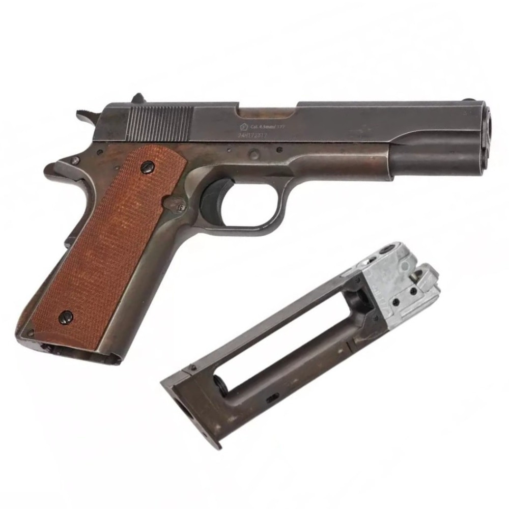 Пневмат Borner 1911 Blowback достовірно копіює американського прабатька практично всіх самозарядних пістолетів сучасності - Кольт 1911, найпроривніший пістолет 20-го століття, грозу дикого заходу, ветеран Першої та Другої світової війни, аргумент гангстерів часів сухого закону. "Бог створив людей різними, полковник Кольт зрівняв їхні шанси". Бурхлива 100-річна біографія залишила відчутний історичний відбиток: знятий з конвеєра, залізний “дідусь”, який витіснив архаїчні револьвери, виборов титул батька-засновника більшості самозарядних пістолетів.