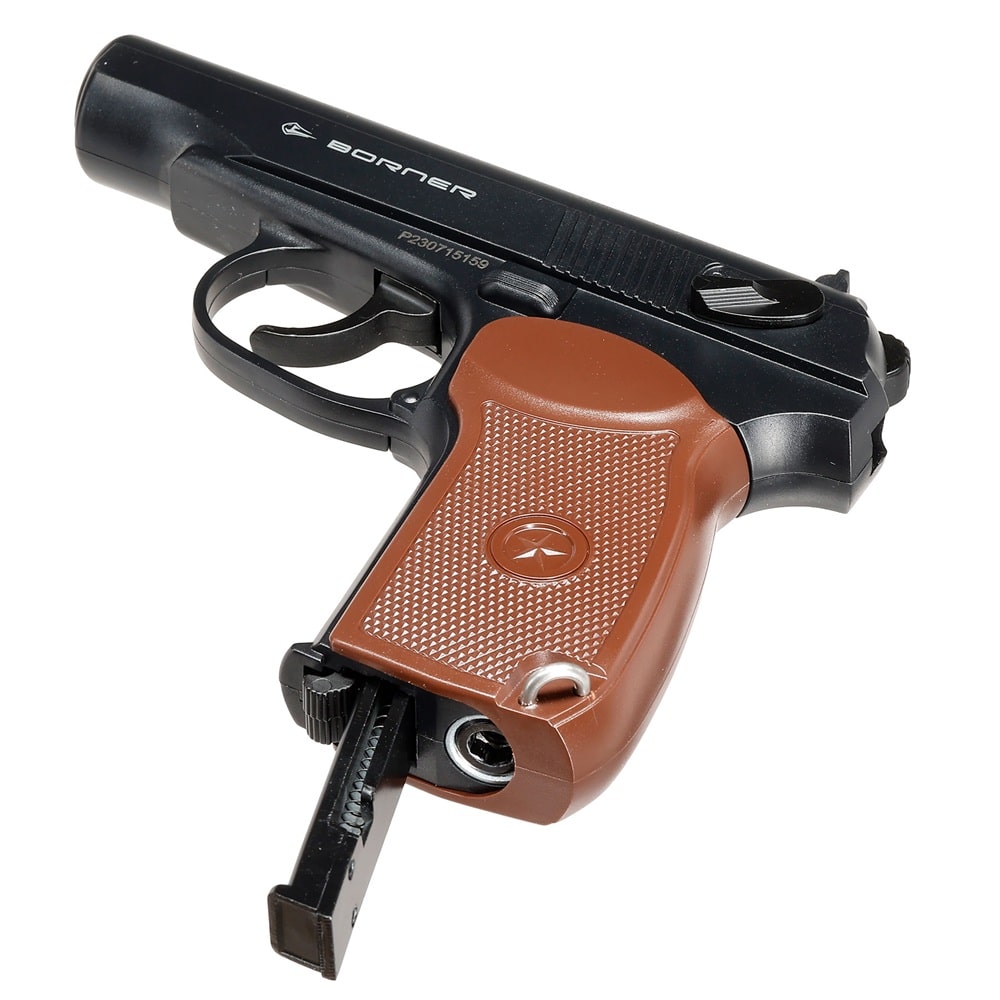 Borner PM №1 – газобалонний пістолет калібру 4,5 мм від преміального американського бренду Borner. Пневмат Борнер ПM №1 – гладкоствольний пластиковий пістолет з нерухомим затвором, без опції Blowback, прапорцевим запобіжником, декоративною затворною затримкою. Borner PM no 1 стріляє сталевими/омідненими кульками BB зі швидкістю 120 м/с, набої заряджаються в металевий компактний магазин; джерело енергії – газовий балон CO2 12 г, який вставляється в рукоятку під зсувну накладку. Ударно-спусковий механізм подвійної дії. Купити пневматику потужністю до 3 Джоулів в Україні можна без дозволу, переробка в бойову/травмат заборонена. Комплект поставки Borner PM №1: