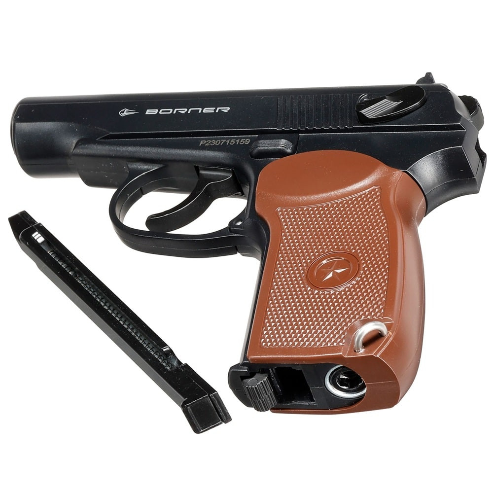 Якщо Ви вже маєте 18 років, у нашому інтернет-магазині Ви можете купити пневматичний Borner PM №1 4.5 mm без дозволу. Оригінальний якісний, надійний пневмат Борнер ПМ №1 від американського бренду Borner за ціною офіційного дилера в Україні без націнок, з усіма ліцензіями та сертифікатами. Відправка зі складу в Київ, Дніпро, Львів, Житомир, Запоріжжя, Харків, Миколаїв, Одесу та ін. Для любителів пневматики - розширений асортимент моделей газобалонних пістолетів та пістолет-кулеметів під автоматичну стрільбу від Борнер з нерухомим затвором та блоубеком, аксесуари для запчастин та ЗІП (клапан, пружина) для ремонту, глушники, муляжи та ММГ, чохли, газові балони, свинцеві кулі та кульки BB для стрільби.