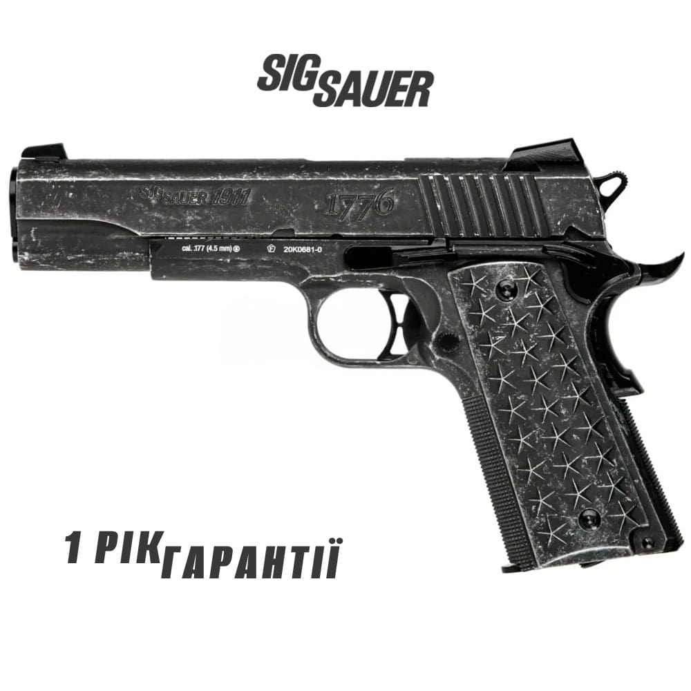Ліцензійна копія Sig Sauer Air 1911 не тільки технологічно досконалий пістолет з високими балістичними показниками, але й має просто шалений вигляд - спеціально потерта, «зістарена обробка», зірки на руків'ї, які символізують 50 штатів, напис збоку «1776» і «We The People» - це справжній ковбой!