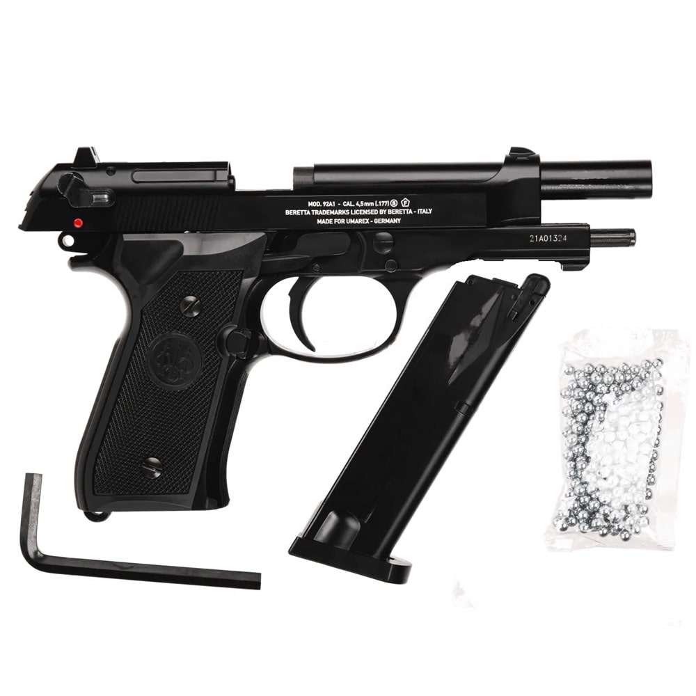 Umarex Beretta M92 A1 blowback – пневматичний газобалонний пістолет калібром 4.5 мм від преміального німецького бренду Umarex. Пневмат Умарекс Беретта 92 А1 - гладкоствольний повноважний пістолет з металевим рухомим затвором та пластиковою рамкою, як у бойового оригіналу, з опцією Blowback та функціональною затримкою затвора, повнорозмірним магазином на 18 набоїв. Стріляє сталевими/обмідненими кульками BB зі швидкістю 90 м/с , джерело енергії – газовий балон CO2 12 г . Ударно-спусковий механізм одинарної/подвійної дії. Оснащений підствольною планкою Picatinni/Weaver. Купити пневматику потужністю до 3 Джоулів можна без дозволу. Комплект постачання пневмату Umarex Beretta M92 A1: