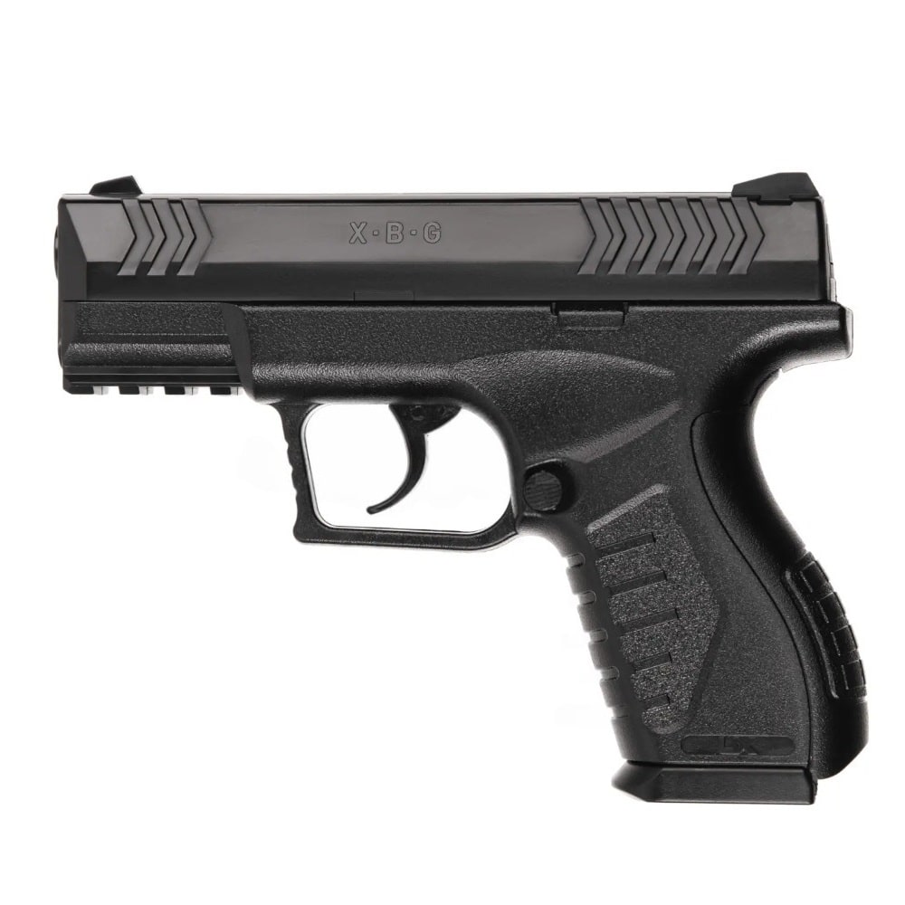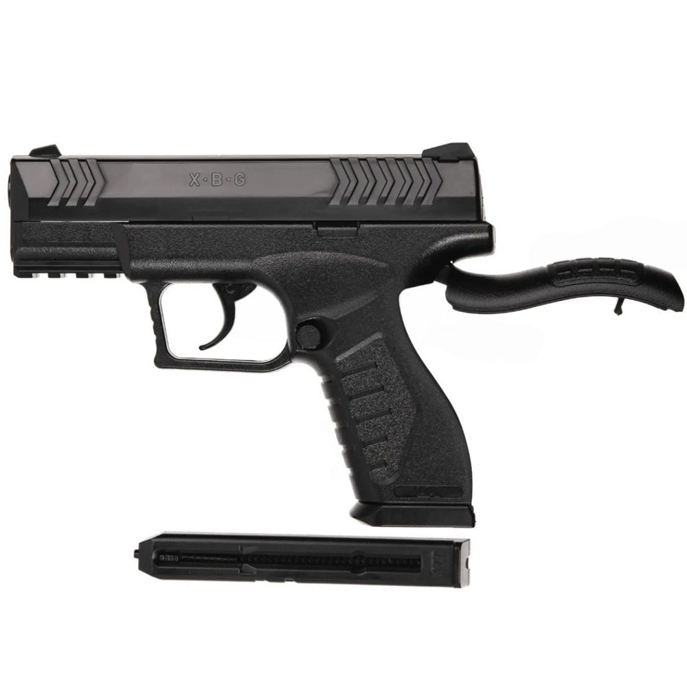 Пневматичний XBG Umarex – газобалонний пістолет калібром 4.5 мм від преміального німецького бренду Umarex. Пластиковий гладскоствольний пневмат Умарекс ХБГ з нерухомим затвором, без опції Blowback, компактним залізним магазином на 19 зарядів, з системою з рухомим стволом. Органи управління – спусковий гачок, кнопка скидання магазину, запобіжник. Стріляє сталевими/обvідненими кульками BB зі швидкістю 125 м/с , джерело енергії – газовий балон CO2 12 г, який заряджається в тильну частину рукоятки і проколюється підтискним винотом з антабкою . Спуск лише подвійної дії. Купити пневматику потужністю до 3 Джоулів можна без дозволу. Комплект постачання пневмату XBG Umarex: