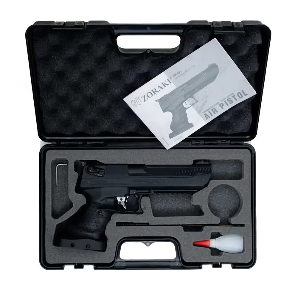 - комплектація - пневматика Зоракі HP-01 Ultra 4.5 мм, кейс для зберігання, олія, дротяний латунний шомпол, інструкція з експлуатації, розбирання та складання.