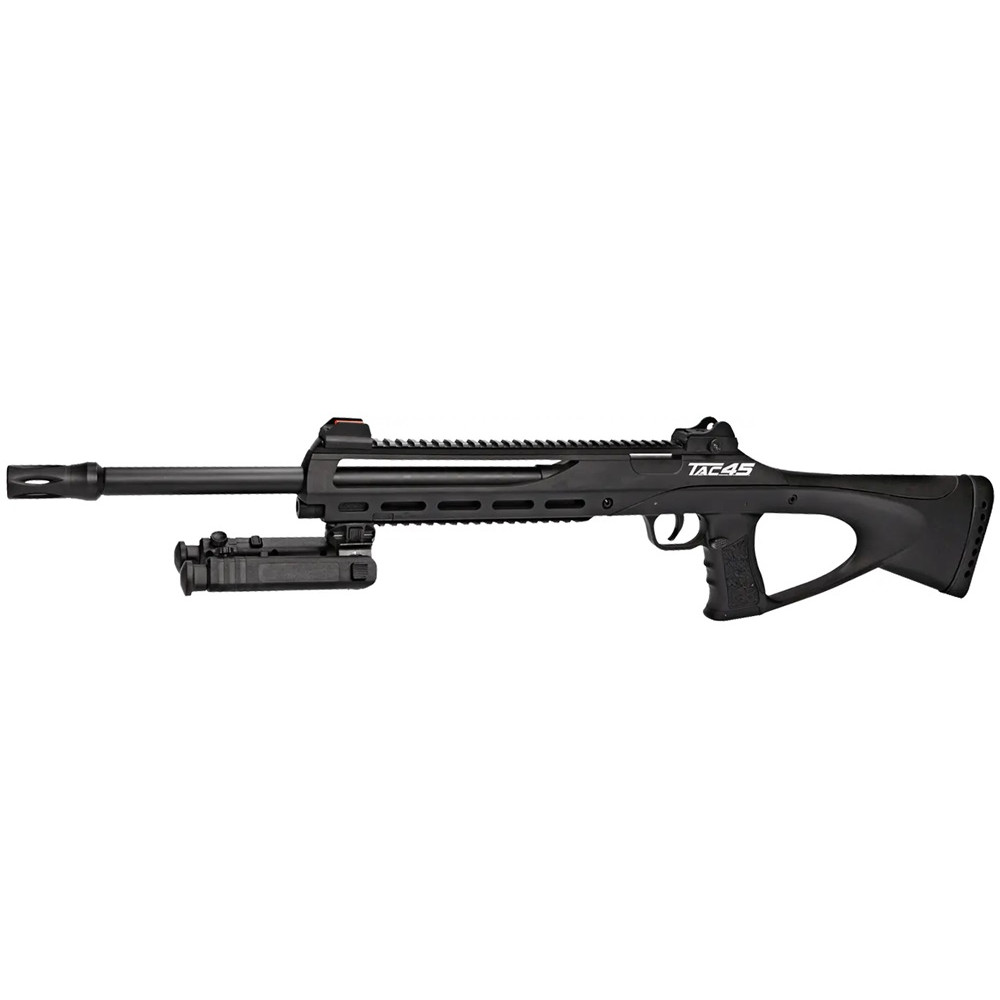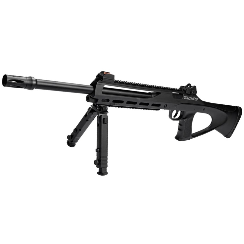 Пневматична ASG TAC 45 - газобалонна гвинтівка калібру 4,5 мм/.177 від преміального данського бренду ASG. Гладкоствольний карабін зі стволом з алюмінієвого сплаву та імітацією полум'ягасника, ложе з нейлонового волокна. Укомплектована верхньою і нижньою планкою Пікатінні/Вівера та телескопічними сошками. Прицільні пристосування - регульований цілик і мушка зі світлонакопичувальним елементом. ASG TAC 4.5 стріляє сталевими/обмідненими кульками BB, зі швидкістю 127 м/с. Джерело енергії - 1 газовий балончик Co2, який заряджається в тильну частину пістолетного руків'я і проколюється підтискним гвинтом з антабкою. Механічний компактний магазин розрахований на 21 кулю. Купити пневматику 4.5 мм в Україні можна без дозволу. Комплект поставки пневматичної ASG TAC 45: