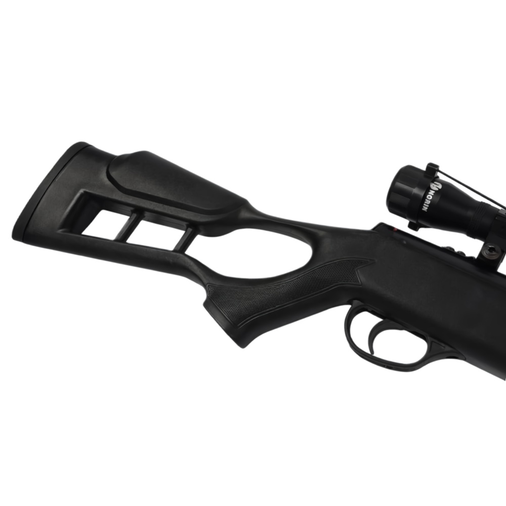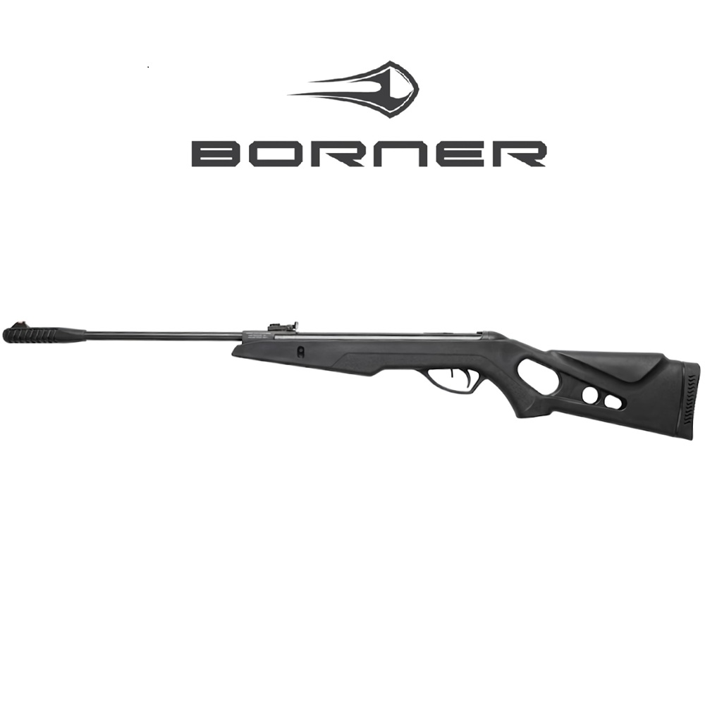 Пневматична гвинтівка Borner N-03 Full Power – пружинно-поршнева переломна воздушка калібру 4.5 мм/.177 класу Магнум від преміального американського бренду. Переломка Борнер Н-03 зі сталевою посиленою пружиною, нарізним стволом, автоматичним запобіжником, платисковим ложем та прикладом типу "Монте-Карло" з високою щокою та гумовим тильником. Воздушка Borner N-03 Break Barrel Air Rifle стріляє свинцевими кулями Pellet із заявленою швидкістю до 310 м/с залежно від ваги кульки, середня потужність/дульна енергія близько 25 Джоулів. Зводиться переломом ствола. Штатні прицільні пристрої - регульований цілік і мушка з фіброоптичною ниткою. Для збільшення прицільної дальності стрільби комплектується оптичним прицілом 4х32. Купити воздушку 4,5 mm в Україні можна без дозволу. Огляд комплектації пневматичної гвинтівки Borner N-03: